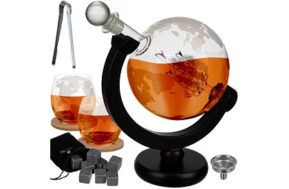 Luxusní sada pro milovníky whisky a cestování, která kombinuje eleganci a funkčnost. Karafa ve tvaru zeměkoule s dřevěným stojánkem, skleničkami, korkovými podtácky a chladicími kamennými kostkami přináší stylový zážitek z degustace. Loď uvnitř karafy vytváří unikátní efekt při nalévání nápoje.