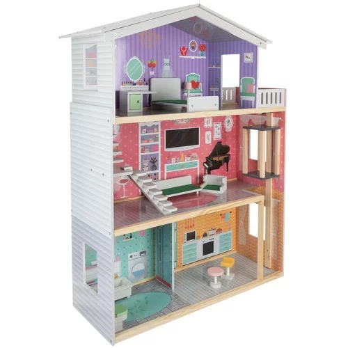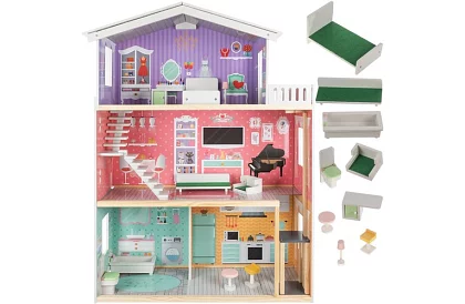 Prostorný dřevěný domeček pro panenky je ideální pro dvě panenky. Nabízí 3 podlaží, 4 pokoje a balkon, takže každá panenka bude mít svůj vysněný domov. Domeček podporuje fantazii a kreativitu při hře a umožňuje dětem vytvářet vlastní příběhy a aranžovat interiéry.