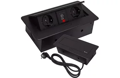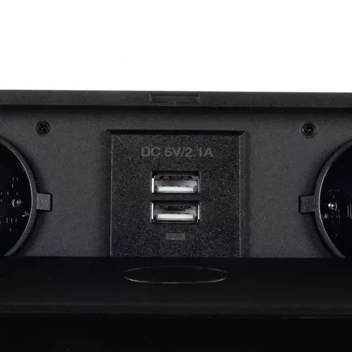 Vestavná výklopná zásuvka kombinuje dvě klasické napájecí zásuvky s uzemněním typu Schuko a dva USB porty 2,1 A v elegantním skrytém pouzdře. Díky ní můžete snadno nabíjet telefon, tablet nebo připojit jiné elektronické zařízení, aniž byste narušili vzhled pracovního stolu. Zásuvka se vysune stisknutím tlačítka a po použití se opět skryje – ideální pro moderní a přehledné pracoviště.