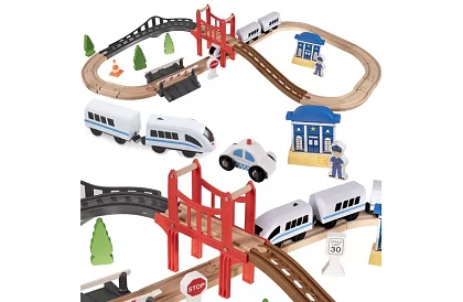 Dřevěná vláčkodráha s délkou 3,2 metru a 37 precizně zpracovanými prvky nabízí nekonečnou zábavu a podporuje dětskou představivost. Děti si mohou vytvářet vlastní tratě, stavět krajinu a hrát si s vlakem, policejním autem, stromy a dalšími doplňky. Magnetické propojení prvků zajišťuje stabilitu a bezpečnost během hry.