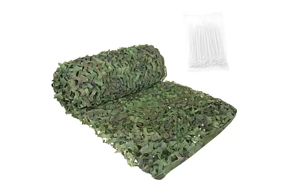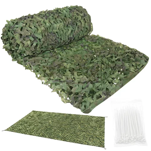 Praktická maskovací síť s lesní kamufláží poskytuje účinné stínění, soukromí a maskování v různých venkovních podmínkách. Velká plocha umožňuje zakrytí pergoly, plotu, vozidla, stanu nebo vybavení při kempování. Lehká konstrukce a voděodolný rychleschnoucí materiál zajišťují pohodlné používání během celé sezóny bez ohledu na počasí. Zesílené okraje umožňují snadné upevnění a přiložené stahovací pásky usnadňují rychlou instalaci bez dalšího nářadí.