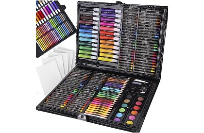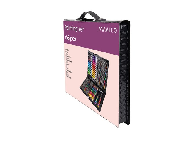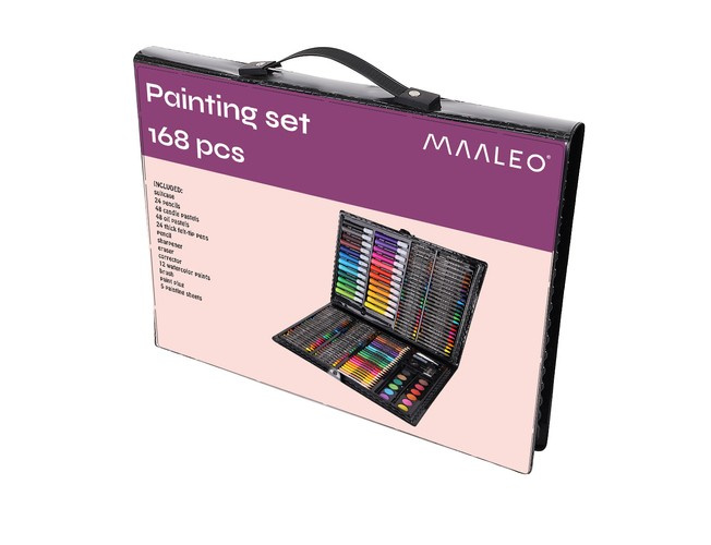 168 prvků – obrovský výběr 24 pastelek, 24 fixů, 48 olejových pastelů, 48 svíčkových pastelů, 12 akvarelových barev, štětec, malířská paleta, ořezávátko, tužka, guma, lepidlo, korektor a 5 listů papíru A4 umožňuje vytvořit nejkreativnější, originální a náročná díla.