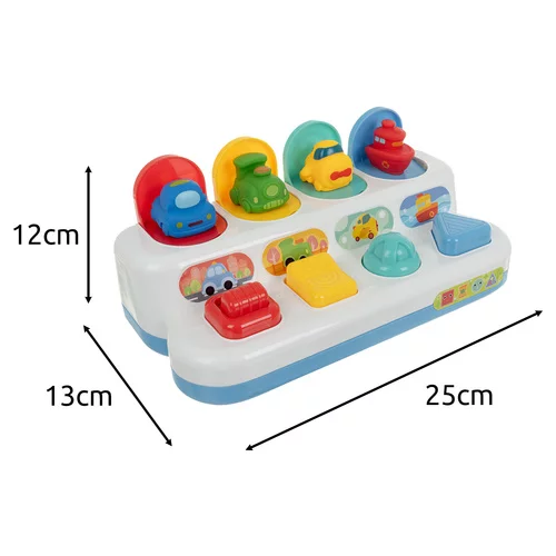 Interaktivní vzdělávací hračka podporuje rozvoj dítěte hravou formou. Stisknutím tlačítek, páček nebo knoflíků se objeví barevná vozidla, což pomáhá rozvíjet koordinaci ruka-oko, jemnou motoriku i logické myšlení. Díky kompaktní velikosti je ideální na hraní doma i na cestách a zároveň učí dítě vztah příčiny a následku zábavným způsobem.