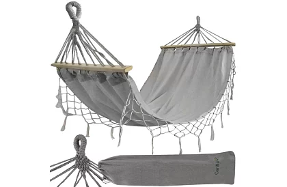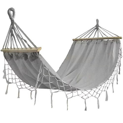 Stabilní a odolná houpací síť nabízí pohodlné odpočinkové místo pro jednu či dvě osoby. Masivní dřevěné tyče a pevná lana zajišťují bezpečné zavěšení, zatímco prodyšný materiál z bavlny a polyesteru poskytuje komfortní a odolné ležení na zahradě, terase nebo balkóně.