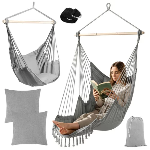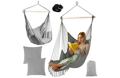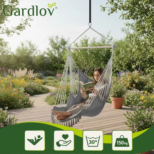 Zahradní závěsné křeslo přináší maximální pohodlí a relaxaci na zahradě, balkoně, terase nebo v obývacím pokoji. Pevná bavlněná látka spolu se stabilní kovovou tyčí poskytuje bezpečné houpání a ergonomickou oporu těla. Dva měkké polštáře zajistí okamžité pohodlí a umožní pohodlné sezení i lehké houpání. Ideální volba pro odpočinek po práci, čtení knihy či chvíle relaxace.