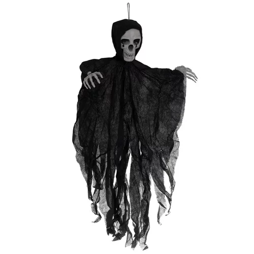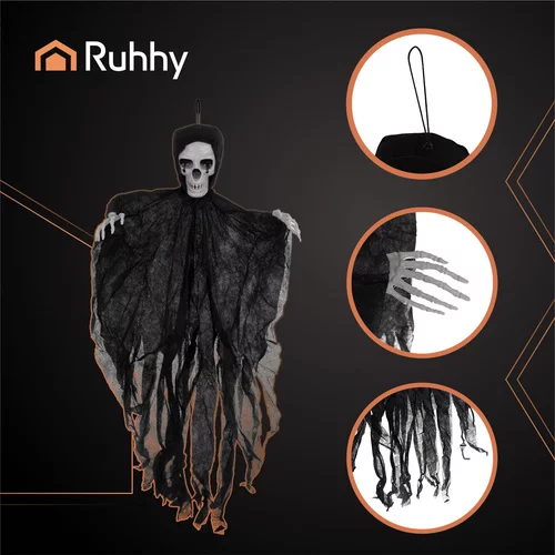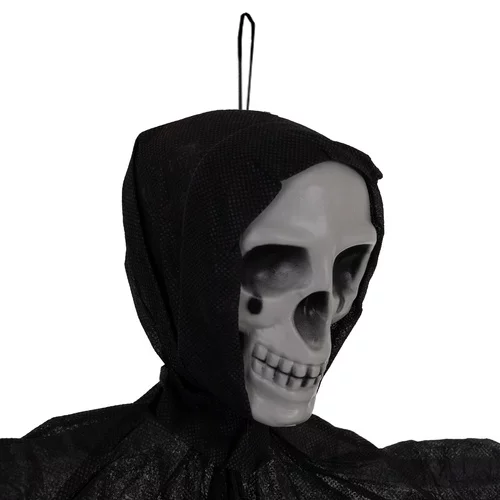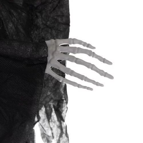 Působivá halloweenská dekorace, která okamžitě navodí atmosféru hrůzy. Realistická kostra s lebkou a potrhanou látkou vytváří dramatický efekt. Díky lehké konstrukci a poutku na zavěšení lze kostlivce umístit kamkoli – na strop, dveře, lampu nebo na zahradu. Pohybující se látka ve větru dodává iluzi vznášejícího se zjevení a velký rozměr zajišťuje, že dekorace přitahuje pozornost. Ideální pro Halloween, tematické večírky nebo pódiové dekorace.